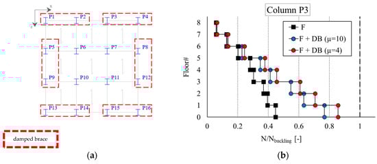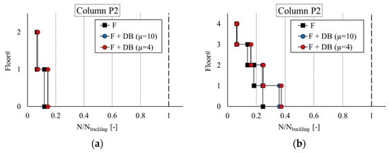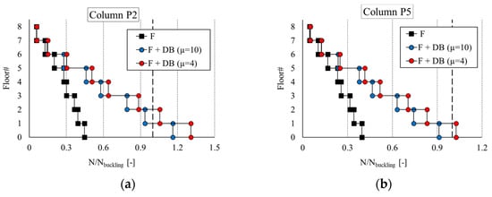 The introduction of the damped braces in a frame causes an increment of the internal forces in the structural members adjacent to the upgraded bay. Therefore, the maximum compressive axial forces of the columns are evaluated at each floor and divided by the corresponding buckling load (Nbuckling) calculated according to IBC [], to check if the buckling capacity is exceeded. Figure 14 shows the check results for the most stressed element of the two-story and four-story MRFs (column P2 according to the layout in Figure 10a), highlighting that, for these structures, the buckling limitation requirement is satisfied. On the contrary, the most stressed elements of the eight-story MRF (columns P2 and P5 according to Figure 10b) do not respect the buckling limit at the first floor in the retrofitted configuration with µDB = 10 and at both the first and second floors in the retrofitted configuration with µDB = 4 (Figure 15a). In Z-direction, the buckling threshold is not respected only at the ground floor by column P5 in the retrofitted configuration with µDB = 4, where N/Nbuckling is equal to 1.025 (Figure 15b).
