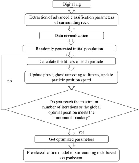 The support vector machine was developed in the 1990s and is based on statistical learning theory. By undertaking structural risk minimization to minimize the actual risk, optimal results can be sought under conditions of limited information. With the continuous development and maturity of support vector machine theory, support vector machines have begun to receive more and more attention, such as Qiu, et al. [22]. To effectively carry out the classification of tunnel-surrounding rock-mass categories, based on the TSP203 system and genetic support, the pre-classification method of the surrounding-rock-mass category of the vector machine uses TSP203 to obtain the surrounding-rock-mass classification parameters; then, the genetic-support vector machine for machine learning is used to classify the tunnel-surrounding rock-mass classification. Therefore, this paper proposes a method for predicting surrounding-rock-mass classifications based on PSO-LSSVM and a digital rig. The digital drilling rig is used to obtain the surrounding-rock-mass classification correlation parameters, and then the particle group-support vector machine is used for machine learning to realize the identification of the surrounding-rock-mass types in the front of the face. This method constitutes a new approach to the classification of surrounding rock categories.