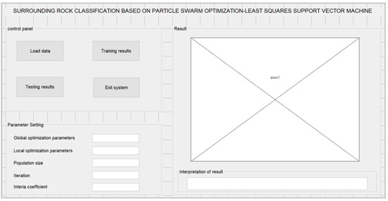 At present, computer technology is the basis for the continuous development of theories and methods in the field of engineering. At the same time, it has also promoted the combination of various techniques and technologies and has produced more practical new theories. Computers have powerful data processing capabilities and fast logic operation capabilities. The empirical method in engineering often brings with it ambiguity and subjectivity. Errors often occur in construction, which increases construction volumes and economic losses. The machine learning method that uses a particle swarm optimization least squares support vector machine, and the digital drilling rig method, are applied to the classification of tunnel-surrounding rock mass. Designed as a dynamic evaluation software for the classification of tunnel-surrounding rock mass, it is a powerful method for undertaking the rapid real-time classification of surrounding rock mass in tunnels. This section uses a comprehensive method of artificial intelligence and digital drilling rigs to design a dynamic surrounding-rock-mass grade-evaluation system, based on particle swarm least squares support vector and digital rig technology, to be applied in the real-time construction of underground engineering circles. Forecasting the surrounding-rock-mass grade of the tunnel has absolute reference value. The dynamic grading interface for the surrounding rock mass is shown in Figure 5.