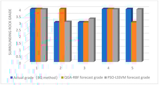 To verify the model trained by the method in engineering applications, reliability and fitness analyses in model learning (as shown in Figure 6) were undertaken. The results show that the fitness gradually decreases with the increase in the number of iterations; that is, the group tends to be optimal, and the speed is reduced most in the first 12 iterations. It is almost unchanged in the following 88 iterations. It can be seen that this method has a breakneck optimization speed and can quickly obtain the optimal global solution and analyze the test results after the model learning is completed (as shown in Figure 7), and find the classification of the method. The results are basically consistent with the results of the actual analysis (BQ classification method). It can be seen that the method is feasible in the advanced classification of surrounding-rock-mass categories, which provides a scientific basis for the construction unit to reasonably arrange the construction progress and reduce the hidden dangers of the project.