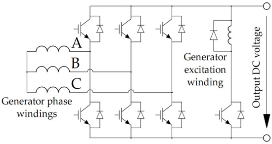 Schematics of the three-phase-controlled rectifier with a DC chopper to supply the excitation winding. The uppercase letters indicate the phases A, B, C of the generator.