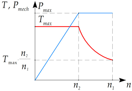 In the traction drive, motors with a wide speed range at a constant mechanical power (CPSR) are common [25]. An unavoidable feature of CPSR is an increased load on the mechanical part (torque) at low speeds. As a natural generalization for a generator, there could be a requirement for a given range of speeds with a constant output power (active power minus the power of the excitation winding). However, at low speeds and high torques, machine saturation and losses increase, and efficiency also decreases. Therefore, even more mechanical power and even more torque are required. Therefore, in this paper, the generator with a given CPSR is considered.