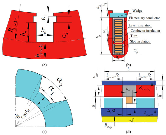 To reduce the number of parameters changed during optimization, the ratio between the excitation winding current and the current in the armature winding layer was taken as constant. The ratio α2/α1 between the geometrical angular parameters of the rotor slot indicated in Table 2 was also taken as unchanged. Because the housing and the rotor sleeve carry out the same flux, the areas of their cross-sections were assumed to be equal.