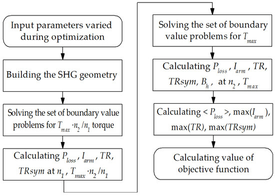 The novelty of this article is to demonstrate that the proposed technique of CAO of the SHG on-load characteristics, based on the simplified model [9] and the Nelder–Mead method, makes it possible to reduce the volume (cost) and the power loss compared to a commercially available counterpart [31]. To overcome difficulties with the long 3D FEA time, it is proposed to use the simplified 2D SHM model presented in [9].