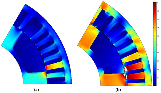 The cross-section of the SHG optimized design and its plot of flux density magnitude (T); areas of extreme saturation (>2T) are colored white: (a) at 3450 rpm and (b) at 750 rpm.