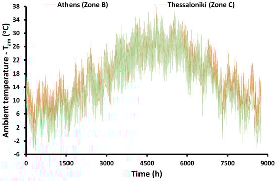 The building thermal loads were calculated with a developed dynamic model in the TRNSYS tool [24]. Two locations were examined in Greece, including one in the south (Athens—Climate Zone B—37°59′ N, 23°43′ E) and one in the north (Thessaloniki—Climate Zone C—40°37′ N, 22°56′ E). The ambient temperature of the locations is depicted in Figure 3. It is clear that during the winter, there are lower temperature levels in Thessaloniki compared to Athens.