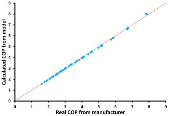 The examined heat pump was investigated with a created model in Engineering Equation Solver. The developed model was validated by using data from the Bitzer software [27]. The validation was performed for different combinations of evaporator and condenser temperature levels. Figure 4 depicts that the points are close to the “y = x” line, which is a fact that proves the high accuracy of the developed model. Moreover, the mean COP deviation was calculated at 0.94%, while the maximum deviation was calculated at 3.01%. The aforementioned deviation values were relatively low, and, thus, the created thermodynamic model is an accurate one.