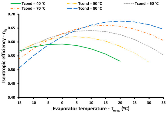 The next step in the thermodynamic analysis was the presentation of the isentropic efficiency for different operating conditions. Figure 5 illustrates that the isentropic efficiency was found in the range of 50.6% to 67.5%. For every condenser temperature, there is a specific evaporator temperature that makes the compressor operate with maximum isentropic efficiency. The global maximum isentropic efficiency was found for [Tcond = 80 °C, Tevap = 20 °C] and it had the value ηis = 67.5%. For low evaporator temperatures, the isentropic efficiency had higher values for lower condenser temperatures. On the other hand, for higher evaporator temperatures, the isentropic efficiency was maximized for higher condenser temperatures. These results indicate that the system presented optimum compressor operation for a temperature lift of around 60 K, which is a characteristic of the examined compressor.