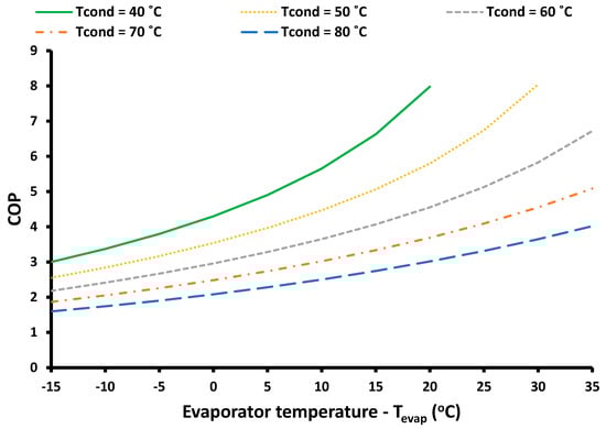 Figure 6 illustrates the COP variation for different combinations of evaporator and condenser temperatures. It is clear that higher evaporator temperature increases the COP, while lower condenser temperatures increased the COP. These are reasonable results because the COP needs a small temperature lift in order to have higher values. According to the results, the COP range was found to be from 1.6 to 8.0 for all the examined cases. It is remarkable that, in Figure 5 and Figure 6, the lines did not have the same range, which is something that was justified by constraints in the compressor operation. More specifically, for Tcond = 40 °C, the evaporator temperature can be up to 20 °C, while for Tcond = 50 °C the evaporator temperature can be up to 30 °C. This fact indicates that a minimum 20 K lift can be achieved with the present heat pump.