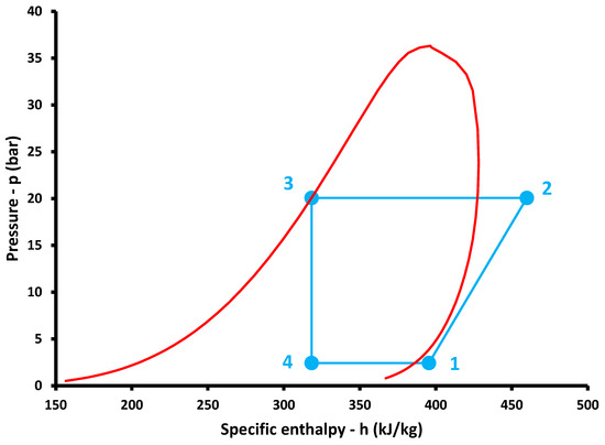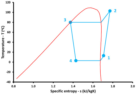At the end of this section, the heat pump thermodynamic charts are presented for a typical case with ambient temperature at Tam = 10 °C, which means that the evaporator temperature is set at Tevap = 3 °C, while Tcond = 80 °C. Figure 7 depicts the temperature–specific entropy (T–s) depiction, while Figure 8 shows the pressure–specific enthalpy (p–h) depiction. Process 1 → 2 is the compression in the compressor, process 2 → 3 is the heat rejection under constant pressure from the condenser to the building, process 3 → 4 is the isenthalpic expansion in the throttling valve, and process 4 → 1 is the heat absorption from the ambient environment under constant pressure.