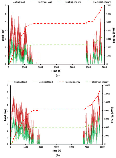 After the thermodynamic investigation, the next step regards the analysis of the total heating system and its comparison with the oil boiler case. The analysis was done for two representative locations in Greece: Athens and Thessaloniki. Figure 9 shows the results of the heating loads, the electrical demand from the heat pump, and the respective cumulative energy quantities. Figure 9a illustrates the results of the simulation for Athens, and Figure 9b illustrates the results of the simulation for Thessaloniki. The maximum heating load in Athens was found at 6 kW, while in Thessaloniki, it was found at 8 kW. Moreover, it is obvious that the heating period was a bit greater in Thessaloniki compared to Athens. More specifically, the heating period in Athens was 3009 h, while in Thessaloniki it was 3847 h. The yearly heating demand in Athens was found at 6785 kWh and the respective electricity consumption was found at 3189 kWh. The yearly heating demand in Thessaloniki was found at 12,591 kWh and the respective electricity consumption was found at 6236 kWh. It is clear that Thessaloniki had approximately the double thermal loads compared to the Athens case.