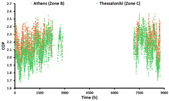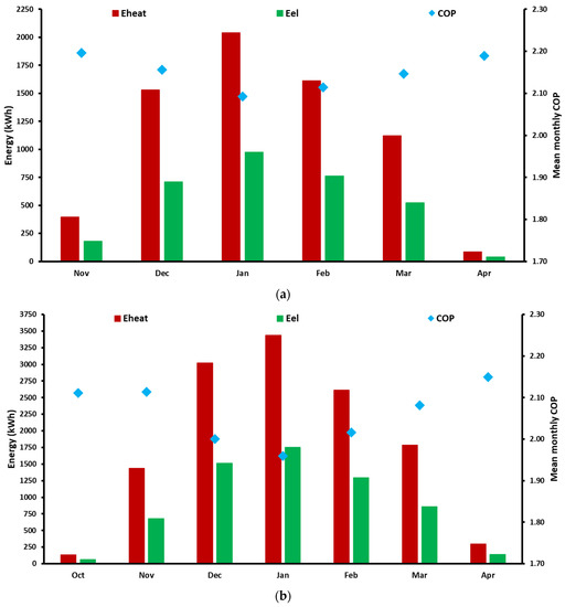Figure 12 shows the monthly results in energy and efficiency terms for both locations. The heating period for Athens starts in November and stops in April, while for Thessaloniki, it starts in October and stops in April. The maximum heating energy demand was found for both locations in January, and, more specifically, it was 2039 kWh for Athens and 3435 kWh for Thessaloniki. The minimum COP was found in January for both locations due to the lower ambient temperature during this month compared to the others. More specifically, the mean monthly COP for January was calculated at 2.093 for Athens and 1.959 for Thessaloniki.