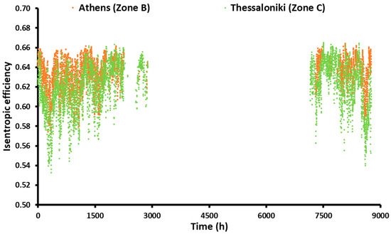 The mean yearly COP or seasonal COP (SCOP) in Athens was calculated at 2.128, while in Thessaloniki it was calculated at 2.019. The lower value in Thessaloniki is reasonable due to the lower ambient temperatures in Thessaloniki compared to Athens, as has been presented in Figure 3. Also, it has to be added that the reduction of the COP with the reduction of the ambient temperature is clear by checking Figure 6. Practically, the lower ambient temperature reduced the evaporator temperature, and consequently, the COP was getting to lower values according to Figure 6. Additionally, Figure 10 depicts the hourly COP variation for both locations during the year. It is clear that the COP values were generally smaller in Thessaloniki compared to the respective values in Athens; the fact verifies the lower mean yearly COP in Thessaloniki. Moreover, Figure 11 shows the variation in the compressor’s isentropic efficiency during the year for both locations. Again, it can be said that the isentropic efficiency in Thessaloniki takes lower values compared to the efficiency in Athens. The mean yearly isentropic efficiency in Athens was found at 63.3%, while in Thessaloniki, it was found at 61.9%.