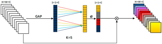 In channel attention, there is local periodicity of channel features, and dimensionality reduction can negatively affect the network’s ability to learn inter-channel relationships. The changes in channel dimension and the interactions between channels can affect the performance of channel attention to some extent. Keeping the channel dimension constant supports network learning. The effective attentional cross-channel interaction can reduce network complexity without performance loss. ECA reduces the complexity of the algorithm and improves the efficiency of learning attention by adding local cross-channel interaction and channel sharing parameters. The channel weights are calculated as follows: