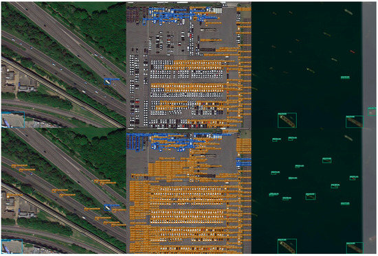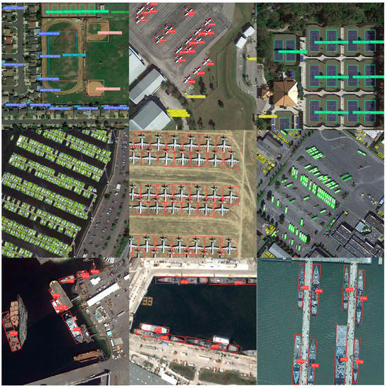 We demonstrate the performance of the improved algorithm through comparative experiments on the publicly available datasets DOTA [41] and Hrsc2016 [42]. The DOTA dataset contains 2806 images of different scales, with resolutions as small as 800 × 800 and as large as 4000 × 4000. It contains 15 categories of data, with a total of 188,282 instances.