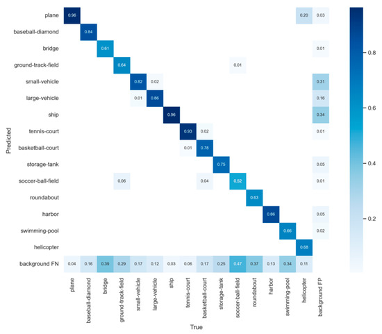 Figure 8 shows the confusion matrix of our method, and we can see the detection accuracy of each category. The best detection results are plane and ship, with an accuracy of 96%, and the worst category is soccer-ball-field, with only 52%. Because the detection of rotated objects is performed, there is a difference in the detection effect of some objects with similar shapes and sizes. Compared to horizontal detection, the angle prediction is added here. In addition, the number of objects in different categories in the dataset varies, which is one of the reasons for the difference in the detection results of different categories of objects. For specific category information and examples, please refer to the relevant documents of the DOTA dataset. It can be seen from the results that our algorithm has a good detection effect on small objects and objects with obvious features in remote sensing images, while the detection of other objects still needs to be improved.