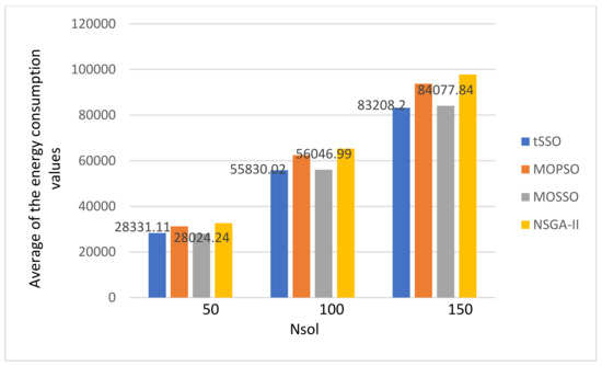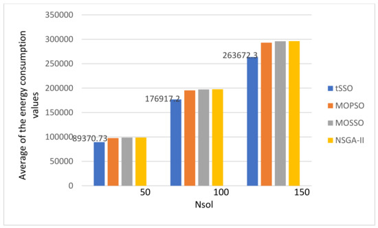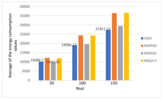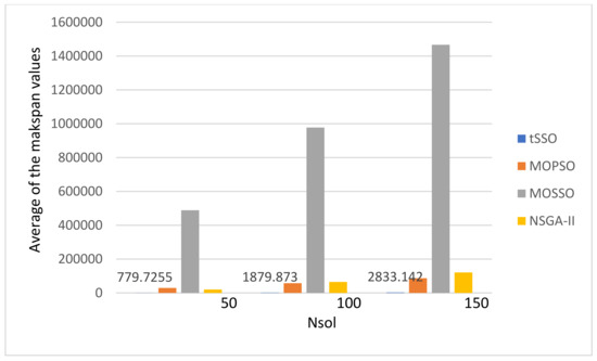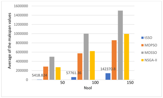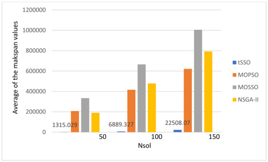 The average of the makspan for the large-size benchmark obtained by the proposed tSSO is the best and is superior to the compared algorithms, including MOPSO, MOSSO, and NSGA-II, as shown in Figure 11.
