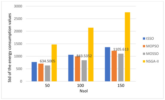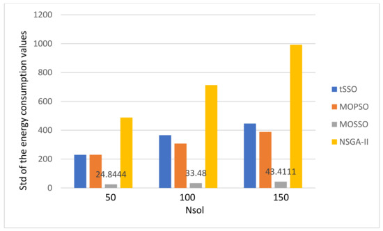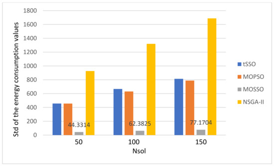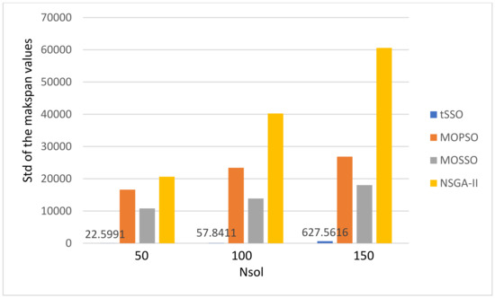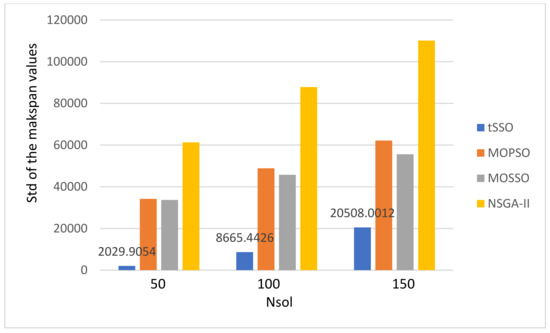The standard deviation of the makspan for the large-size benchmark obtained by the proposed tSSO is the best and is superior to the compared algorithms, including MOPSO, MOSSO, and NSGA-II, as shown in Figure 12.
