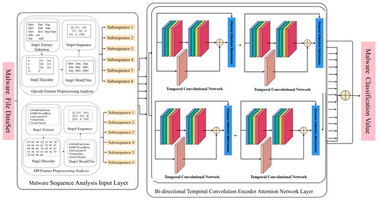 To avoid the gradient disappearance and explosion problems of CNN, enhance the ability to extract temporal features, and mine bidirectional information to further improve the classification accuracy, the classification method of BiTCN is introduced to enhance the generalization ability and classification accuracy of the malware variants. On the one hand, the API calls reflect the malware behavior of the malware and can avoid the effects of the obfuscation techniques. Assembly sequences reflect the control behavior over the system kernel and can compensate for the inability to distinguish polymorphic APIs. On the other hand, the convolutional network in a TCN [25,26] has the property of parallelizable computation, which can effectively solve the problem of excessive time consumption and has been proven to be superior to traditional RNN and its variants in several fields. However, single-item TCNs cannot encode information from back to front, resulting in the inability to capture the association between current and subsequent feature items. The introduction of BiTCN into malware classification has improved both its anti-confusion capability and accuracy.