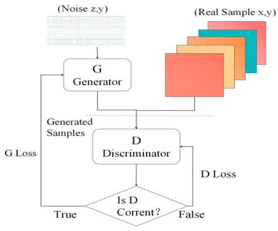The GAN is inspired by game theory, where it is used for modelling complex distributions of real-world data. It consists of a generator (G) and a discriminator (D) [23]. The generator captures the underlying distribution of real data samples and generates new data samples. The discriminator is a binary classifier that determines whether the input samples are real or generated [24]. The optimization process is a min-max game problem whose goal is to keep a balanced sample distribution. The objective function for the GAN is: