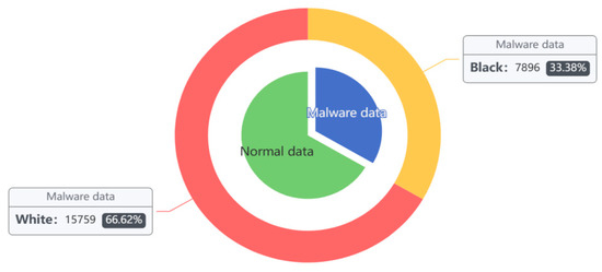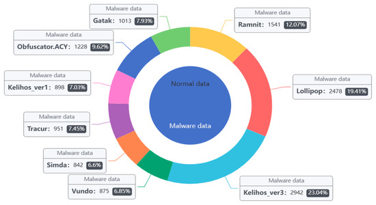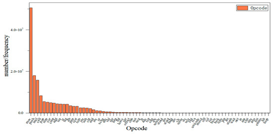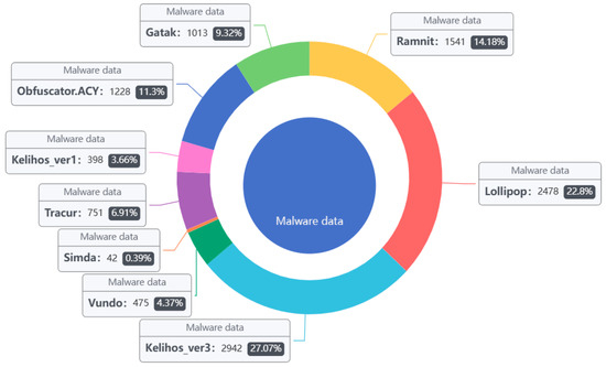 The Kaggle [33] malware data set utilized the samples (see Figure 5 and Table 1). The malware families in the dataset provided by Microsoft were divided into nine categories, a total of 10,868 malware samples. Each sample file has two formats: .asm and .bytes. Each malware file has an identifier (a 20-character hash that uniquely identifies the file), and a class label (an integer that indicates one of the nine family names to which the malware belongs). In addition to this, the dataset not only includes the list of raw data, but also contains logs of various raw data information extracted from the binary files, (e.g., function calls, API, and parameters).