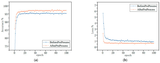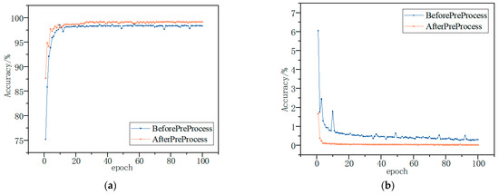 It can be seen that by using the features following the Spearman’s correlation coefficient selection, the proposed model is able to accurately classify and detect malware on both datasets, with a significant improvement in accuracy and convergence speed relative to the pre-feature selection. The results show that the use of feature selection can largely mitigate the impact of unbalanced malware family samples, thus improving the final detection accuracy.