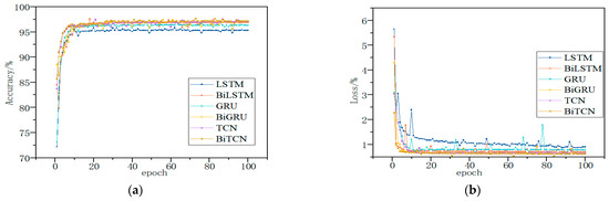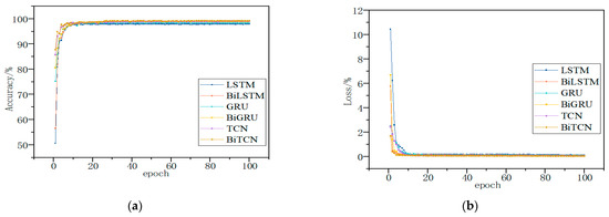Through comparative experiments, it was verified that BiTCN achieved better results in malware classification. The dataset was processed using the SFCWGAN under the same experimental conditions and then trained on a long short-term memory network (LSTM), bidirectional long short-term memory network (BiLSTM) [39], gated recurrent unit (GRU), bidirectional gated recurrent unit (BiGRU) [40], TCN and BiTCN. The results of different algorithms for malware behavior analysis are shown in Table 9 and Table 10 and Figure 13 and Figure 14.