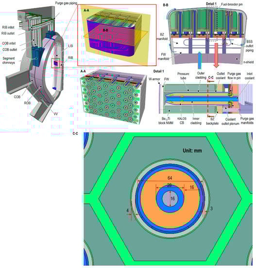 The design status and descriptions of the fuel-breeder pin concept of the HCPB blanket is described elsewhere [1]. For completeness, the HCPB blanket is shown in Figure 1. The axial length of the fuel-breeder pin is about 570 mm. The other dimensions of the fuel-breeder pin are shown in Figure 1C-C. For the fuel-breeder pin concept, even with a roughness of Rz = 260 µm on the surfaces of the annular channel of the fuel-breeder pin, the pressure drop of the blanket unit-slice was about 0.34 bar. While for the previous cooling plate concept of HCPB [14], the pressure drop of the blanket unit-slice was about 2 bar when using smooth channel [14]. This implies the superiority of the fuel-breeder pin concept in terms of lower pressure drop. For qualifying the HCPB blanket concept, it is planned that the testing of this mockup will be done under DEMO-relevant conditions in the high temperature, high-pressure facility—Helium Loop Karlsruhe (HELOKA) [15]. It is wished that this mockup would act as a validation rig for better understanding of the design margins to ensure a feasible operation of this concept.