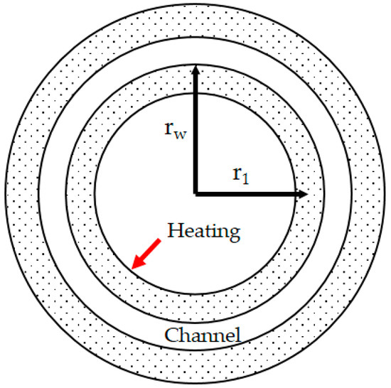For obtaining the average Nusselt number through the thermal hydraulics experiment, the Equation (1) could be used. Here, Nu is the Nusselt number, Dh is the hydraulic diameter; λf is the thermal conductivity of coolant at bulk temperature; h is the convective heat transfer coefficient. is the wall-to-fluid heat flux; Tw is the temperature at the coolant-contacting wall; Tf is the bulk temperature of coolant. Once the geometry is given, the Dh is known. The unknowns that have to be derived from measured data are λf, , Tw, and Tf. can be calculated approximately by Equation (2), where λs is thermal conductivity of steel. Tf can be obtained approximately by Equation (3). Where Tinlet is coolant inlet temperature, Q(x) is the integrated power up to location x, cp is the specific heat of the coolant, and is the mass flow rate. The λf could be obtained from literature data, once the bulk temperature is known. Tw can be obtained by Equation (4). T1 is a measured thermocouple temperature, r1 is the radius, at which place the thermocouple is installed, rw is the radius of inner surface of the annular channel, see Figure 2.