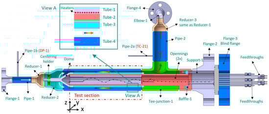 Tube-2 acts as the tube carrier for the Tube-1 (for heaters) and Tube-3 (for roughness). There are grooves for the three wire-form electric heaters. After winding into the grooves on Tube-1, the heaters are then brazed with Tube-1 and Tube-2. The Tube-3 is attached to Tube-2 using tack welding, which allows the Tube-3 to be dismantled from the Tube-2. At the upstream region, there is a cover-dome for guiding the coolant to flow into the annular channel formed by Tube-3 and Tube-4. Now, the Tube-1, Tube-2, and Tube-3 are bundled together, thereafter called insert-tubes. The region containing the tubes Tube-1, Tube-2, Tube-3, and Tube-4 is also called the test section. The outer contour of the mockup is driven by the dimension of Tube-4 (DN 150-120), which was determined using the above-mentioned upscaling methods. The Flange-1 is used to connect the mockup to the helium loop, whose pipe size is smaller than Tube-4. Therefore, two reducers are used to connect the Flange-1 to Tube-4. Tube-4 is then connected with a T-junction. The 90° branch is welded to Pipe-2 for returning the flow to the helium loop (see Figure 4). Again, a reducer (Reducer-3) is used for the transition of differently sized pipes. Between the Reducer-3 and the Flange-4, an elbow is used for accommodating thermal expansion. The straight branch of the T-junction is for facilitating the exchange of the insert-tubes and the feedthroughs of the electric heaters and thermocouples (TCs) through the Flange-2. These feedthroughs are needed for ensuring the tightness of mockup. The insert-tubes are connected by three evenly spaced support rods to a thick circular plate between the Flange-2 and Flange-3. The Flange-2 has an outer diameter of 395 mm. The total horizontal length from the inlet flange (Flange-1) to the end-tip of feedthrough is about 2080 mm. The vertical height of the mockup is about 898 mm. The total mass of this mockup (without considering isolation) is about 362 kg. The insert-tubes, which are planned to be exchanged during the experimental campaign, have a mass of about 67 kg.