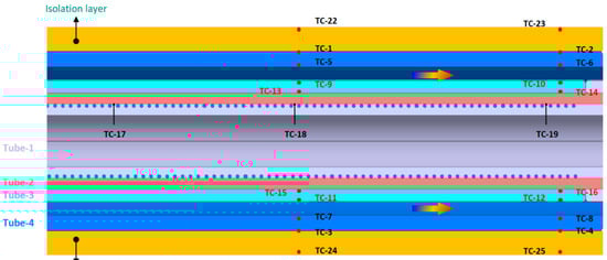 To obtain the unknown quantities in Section 2, many temperature measures are needed. The locations of the thermocouples in the test section are displayed in Figure 5. The whole mockup is installed into a robust metallic tank, which is exposed to environment air through small, opened windows. By doing this, the staff would not be affected in case of a breakage of the mockup. In order to minimize the heat loss from the mockup to the environment, all the mockup parts are wrapped in 4-layer thick isolation layers (totally about 115 mm thick, not scaled in Figure 5). At the test section, two axial locations are chosen to measure the temperature in order to obtain information both at the axial-half length and at the proximity of the full length of the test section. To be redundant on the measure, pairs of thermocouples are used at the same axial and radial location, e.g., TC-1 pairing with TC-3. The number of thermocouples is also limited by the maximum number that the facility can accommodate. The thermocouples TC-1 to TC-8 are on the Tube-4 for measuring the temperature at the middle and on the end of Tube-4 to determine the heat flow from the mockup to the isolation layer. The thermocouples TC-22 to TC-25 are attached on the outer-surface of the isolation layers; together with TC-1 to TC-4, these TCs are used to obtain the heat loss from the mockup to the environment. The thermocouples TC-9 to TC-16 are used to determine the heat flux from the solid to the coolant. The thermocouples TC-17 to TC-19 are used for monitoring the temperatures of three electric heaters.