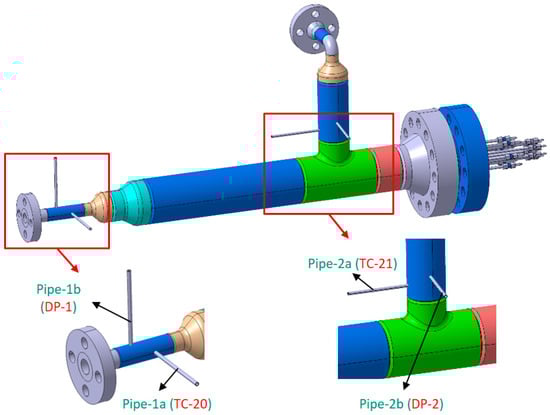 Upstream of the test section, there are two small pipes (called Pipe-1a and Pipe-1b) for accommodating the thermocouple (TC-20) and pressure tap (DP-1). At the downstream region of the test section, there are also thermocouple (TC-21) and pressure tap (DP-2). The locations of these thermocouples and pressure taps are depicted in Figure 6. Since we are more interested in the temperature measure in this work, the TC-20 and TC-21 are placed closer than DP-1 and DP-2 to the test section. A differential pressure sensor is connected to the mock-up inlet (Pipe-1b) and outlet (Pipe-2b) via two pressure taps DP-1 and DP-2.