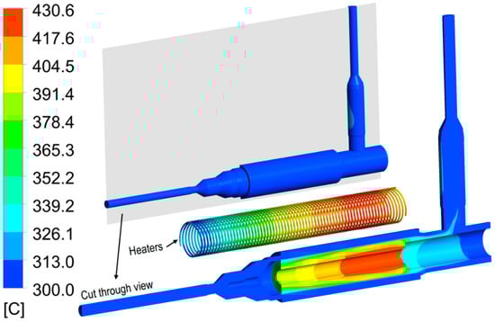 The velocity streamline of the coolant is shown in Figure 8. The temperature contour of the mockup is shown in Figure 9. The hotspots are located at the heaters and the Tube-1, which surrounds the heaters. Maximum temperature of the tube is 430.6 °C, well below the allowable operating temperature 550 °C. The total pressure drop between inlet and outlet is calculated to be about 390 Pa.