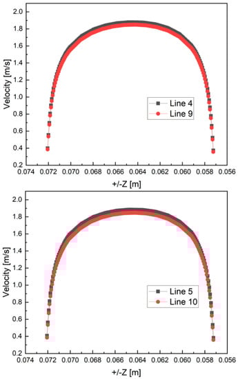 Velocity profile at lines 4 vs. 9 and 5 vs. 10.