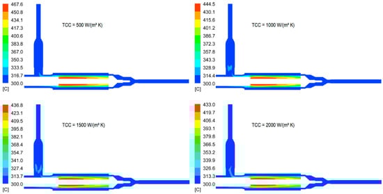 As the contact between Tube-1 and Tube-2 is ensured via brazing, a perfect contact between them is assumed. The TCC between different tubes will influence the heat transfer between them. Therefore, for the sake of model robustness, a scoping study varying the TCC values between Tube-2 and Tube-3 should be done. The scoping study considers four different TCC values between Tube-2 and Tube-3: 500, 1000, 1500, and 2000 W/(m2 K), all below the nominal value 2400 W/(m2 K). The temperature fields of the four cases are shown in Figure 14. It can be seen that the maximum temperature 467.6 °C on the mockup occurs at TCC = 500 W/(m2 K), which implies that the mockup will be safe (Tmax < 550 °C), even with a very low TCC.
