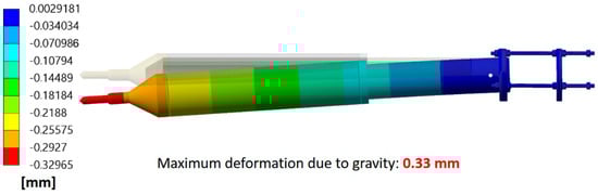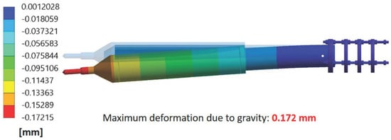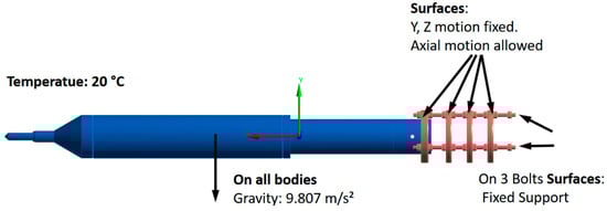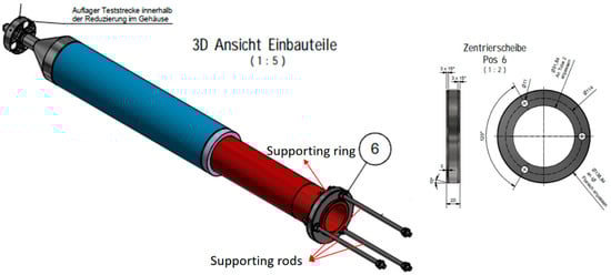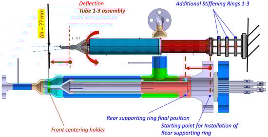 In order to hold the tube insert in position, its rear part is supported by the supporting rods connected via the supporting ring, see Figure 15. In the original design, as shown in Figure 3 and Figure 4, there is only one supporting ring. However, after discussion with the manufacturing partner, it was suggested to have additional stiffening rings for reinforcement. Therefore, FEM analysis was done to check the deflection of the front part of the tube insert due to self-weight. Two cases were studied. The first one (case 1) with one additional stiffening ring, the second one (case 2) with three additional stiffening rings. The boundary conditions for case 2 are shown in Figure 16. Similar boundary conditions for case 1 were used.