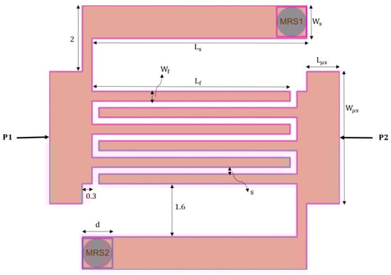 Proposed unit cell P-CRLH phase shifter with Magneto-static field Responsive Structures (MRSs). All dimensions are in mm (). The overall size is at the design frequency of 5.5 GHz.