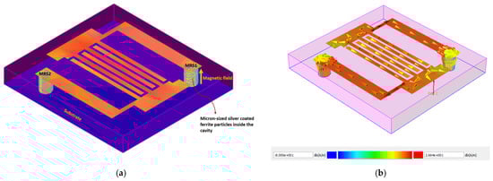 Isometric view of the proposed unit cell P-CRLH phase shifter with (a) magnetic alignment of particles in Magneto-static field Responsive Structures (MRSs); (b) Surface current distribution at 5.5 GHz when particles inside the MRS are activated.