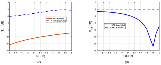 Illustration of connection/disconnection of a stub with the ground plane using magnetic particle activation/deactivation inside the MRS cavity. (a,c) Surface current distribution and S parameters for a disconnected stub with the ground plane, (b,d) Surface current distribution and S parameters for a connected stub with the ground plane.