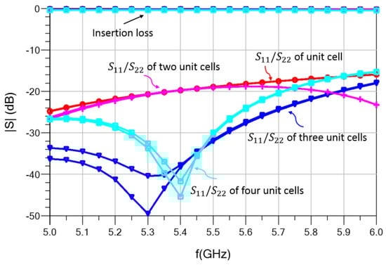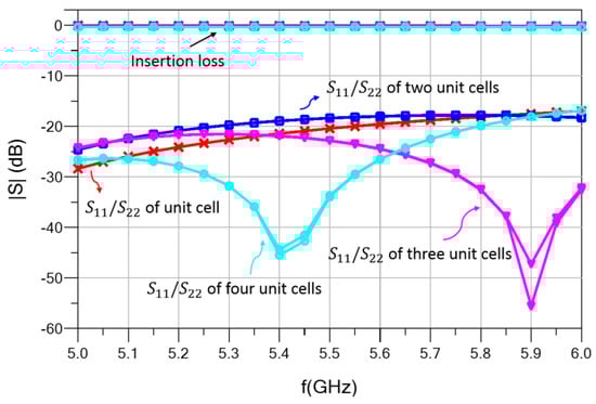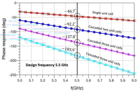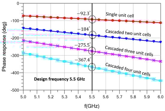 The simulated phase responses for the unit cell and cascaded unit cells P-CRLH phase shifter are shown in Figure 5. At the design frequency of 5.5 GHz, the phase shift from port to for a single-unit cell is . For cascaded unit cells, the total phase shift simply adds as demonstrated in [33]. Therefore, for cascaded two-unit cells, the calculated phase shift is , for cascaded three-unit cells, the calculated phase shift is 3 and the calculated phase shift for cascaded four-unit cells is 4. The simulated phase shifts in Figure 5 for cascaded two-, three- and four-unit cells are , and , respectively. The range of phase error is . The effects of the phase error on phased array antenna will be discussed in Section 3.
