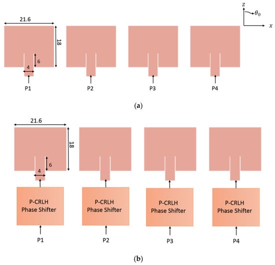 A 1 × 4 linear phased array with: (a) directly excited phases and (b) P-CRLH-excited phases.