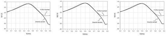 A four-element linear patch antenna array operating at the design frequency of 5.5 GHz is simulated in ADS 2016 Momentum. The inter-element center-to-center spacing is with the substrate having a thickness of 1.27 mm, 2.2 and = 0.002. The schematic of the 1 × 4 array with directly excited and integrated P-CRLH phase shifters is shown in Figure 8. The mutual coupling between the adjacent antenna elements for directly excited and P-CRLH-excited phase shifters are shown in Figure 9. The maximum mutual coupling is 13.5 dB at the design frequency for both the direct- and P-CRLH-excited array. From (5.8–6) GHz, the mutual coupling for the directly excited array is significantly less than the P-CRLH-excited array. A ladder resonator [34] can be used to reduce the mutual coupling effects in the patch antenna array structure at the resonant frequency. Next, the P-CRLH phase shifters designed in Section 2.1 and Section 2.2 will be integrated with the array to test their performance for main beam scanning applications.