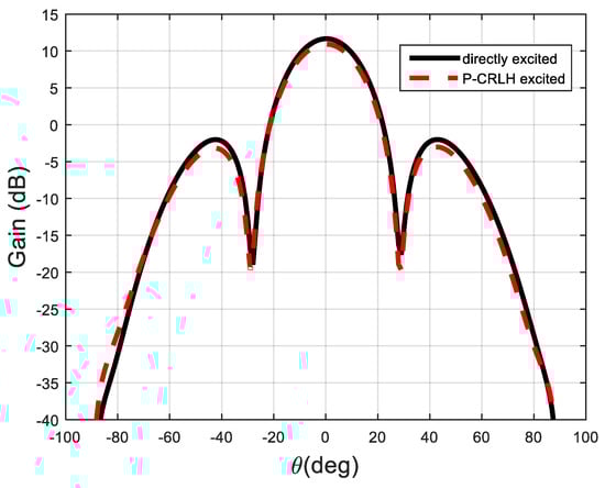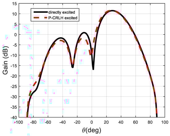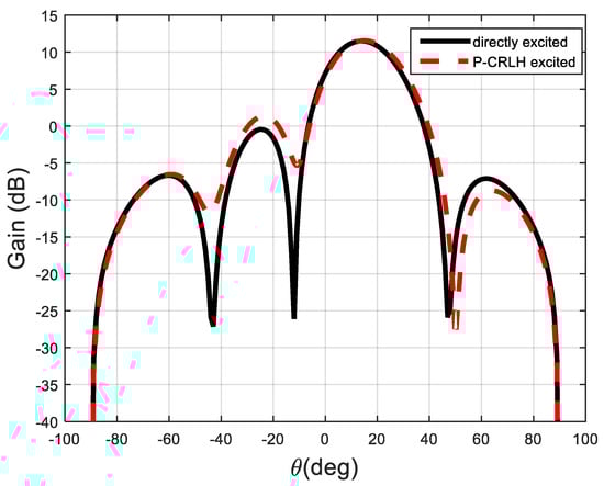 For the main beam at the broadside, the four patch antenna elements in Figure 8 are individually excited with the unit cell P-CRLH phase shifters in Section 2.1. This will make the feeding of antenna elements with the same phases () at the design frequency of 5.5 GHz and will result in a constructive radiation pattern at the broadside direction. For comparison, the patch antenna elements in the array are directly excited with phases equal to . The simulated far-field radiation patterns with directly excited and P-CRLH-excited phases are shown in Figure 10. Overall, there is a good agreement between the two results with a 0.7 dB difference in the broadside gain and a 1.1 dB difference in the first sidelobe level.