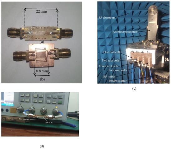 Photographs of the fabricated (a) unit cell P-CRLH phase shifter reported in [29]; (b) proposed unit cell P-CRLH phase shifter; (c) a 1 × 4 linear phased array with integrated proposed P-CRLH phase shifters in an anechoic chamber and (d) unit cell P-CRLH phase shifter measurements.