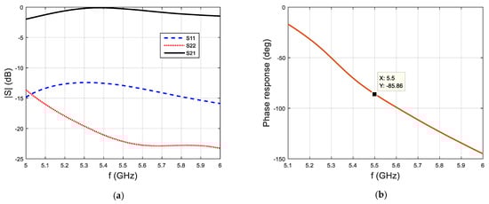 To achieve a phase shift, the unit cell P-CRLH phase shifter in Figure 1 with mm (all other dimensions remain the same) is simulated in the ADS 2016 Momentum environment. The same electromagnetic (EM) setup parameters are used as for the − case in Section 2.1. The simulated S parameters and phase response results are shown in Figure 6 and Figure 7, respectively. The results in Figure 6 show good impedance matching characteristics and insertion loss indicating the propagation of the electromagnetic wave from port 1 to port 2. The calculated phase shift values for unit and cascaded P-CRLH phase shifters at the design frequency of 5.5 GHz are , , and , respectively. The corresponding values of the simulated phase shifts achieved are , , and , respectively, as shown in Figure 7. The range of phase error between the calculated and simulated phase shifts is . The effects of the phase error on the phased array antenna will be discussed in Section 3.