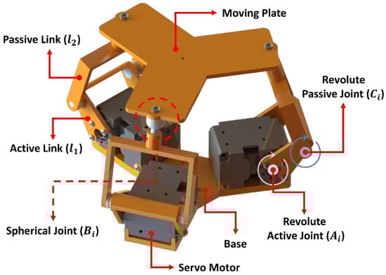 On the other hand, a parallel manipulator (3-RRS) was implemented for the new hybrid manipulator, and the CAD model is presented in Figure 3. Roll (), pitch (), and heave () are the three degrees of freedom for the manipulator, which represents the position of the moving platform as . The model comprises three limbs, and each one has an active link with length () and a passive link with length (). Moreover, it contains three joints with a revolute active joint at point (), a revolute passive joint at the point (), and a spherical joint at the joint (). The active joint variable factors are grouped as . While the passive joint variable factors are grouped as . Therefore, the 3-RRS parallel robot contains a triangular base with center , as shown in Figure 4a, and a triangular moving platform with center ; thus, , , as shown in Figure 4b,c. In addition, there are two coordinate systems for the base, and for the moving platform, which aid in the analysis. The -axis was chosen in the direction of and the -axis was chosen in the direction of . In addition, three servo motors fixed at the base (one for each limb) were used to move () of the moving platform.