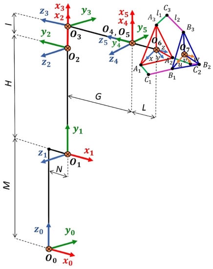 Therefore, the position and orientation transformation matrix between and can be determined using the Denavit–Hartenberg (D-H) parameter and can be obtained as in Table 2.