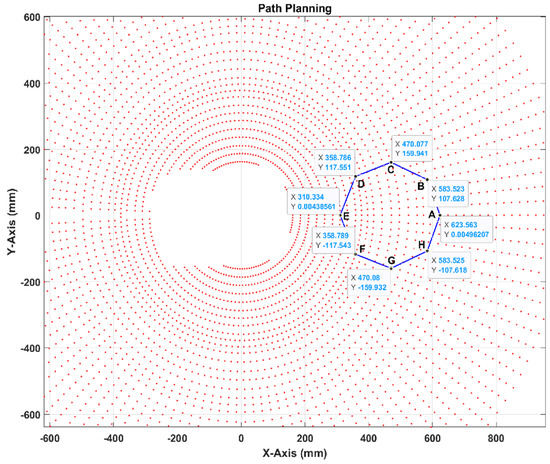 The inverse kinematic must be solved to create a path for the new hybrid manipulator. However, the new serial-parallel robot has nine unknown angles, and it is complex to solve these unknown parameters; thus, we will trace a new method to follow the path. This method will depend on the previously obtained workspace and the extraction of a slice at the Z = 0 plane, as shown in Figure 9a. Furthermore, this workspace contains thousands of points with each point recording nine angles for the position and orientation of the new hybrid manipulator end effector. Figure 9b shows the selected surface (XY plane) after being extracted from the 3D workspace, while Figure 10 shows the selected points (A, B, C, D, E, F, G, and H), which represent the octagon path. Moreover, Table 5 shows the selected points with all nine angles (…), position (x, y, z), and orientation (A, B, C).