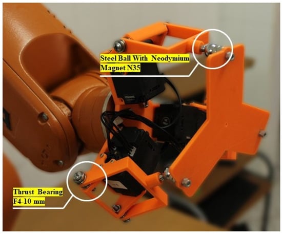 In the beginning, the 3-RRS parallel manipulator must be prepared to be attached to the KUKA KR6 R900 serial robot. It was designed using SOLIDWORKS software and implemented using a 3D printer. Moreover, it was provided with a thrust ball bearing at the passive joint () to prevent friction between the active link and the passive link. Furthermore, it will support the axial load on the joint, while at the spherical joint () a ball joint with a neodymium N-35 magnet was used for flexibility of movement, easy installation, and fast replacement with other end effectors, as shown in Figure 11. Finally, the 3-RRS was supported with three DYNAMIXEL servomotors (XL-430), which provide many features, such as serial communication, PID control, feedback of position angle, speed, temperature, and load.