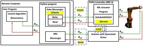 Figure 12 shows the experimental setup, which contains the 3-RRS parallel robot mounted in the end effector of the serial manipulator KUKA KR6 R900. Then, the KRC4 KUKA controller was prepared and installed with KUKAVARPROXY, which can read or write variable data on the KUKA manipulator [33]. Further, it converts the controller to a server that can host up to ten clients. The KRC4 controller is connected via TCP/IP with the Raspberry Pi (client computer), which is provided with a Python code that can send the required joints to the KUKA controller and Arduino, via USB connection. Furthermore, Figure 13 describes the experimental process required to control the hybrid manipulator and follow the required path, where , , and represent the required joint angles for the hybrid manipulator, the KUKA robot, and the 3-RRS parallel manipulator. Here, , , and represent the joint angle feedback for the hybrid manipulator, the serial KUKA serial robot, and the 3-RRS parallel manipulator, respectively. The Python program includes the KUKA messenger protocol to send data (read/write) to the KUKA KRC4 controller through KUKAVARPROXY, while it has a 3-RRS messenger, which is responsible for communicating with the 3-RRS parallel manipulator through ARDUINO. Additionally, the KRL (KUKA Robot Language) program can actuate the KUKA robot from the data received via the KUKAVARPROXY. Finally, there is a digital input/output interface between the KUKA controller (KRC4) and the 3-RRS controller (Arduino) for synchronization between the KUKA manipulator and the 3-RRS manipulator.